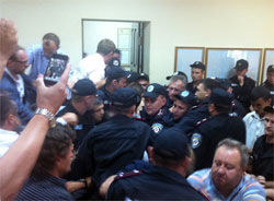 Як повідомив Олександр Турчинов, наразі у коридорі, перед залою засідань, все заблоковано співробітниками міліції. До зали, попри те, що судове засідання відкрите, не допускають ні народних депутатів, ні громадян, ні журналістів.