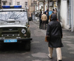 Біля столичного будинку на вулиці Городецького постійно чергує міліцейський ”бобик”. Вхід до будинку вже кілька разів намагалися захопити молодики з комерційної фірми (фото: Євген КОЛЕСНИК) |