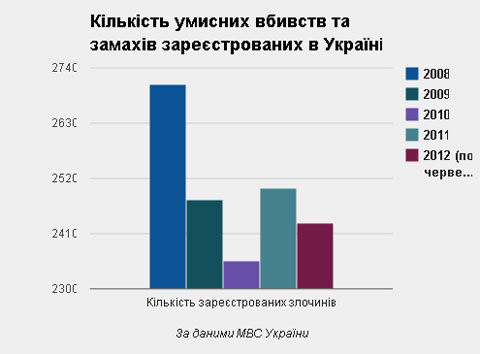 Згідно з ним, у 2010 році в Україні було зафіксовано найменшу кількість замахів на життя та умисних убивств за 18 років. Однак, як показав аналіз офіційних повідомлень прес-служби МВС, у минулому році умисних убивств та замахів було скоєно вже як мінімум на 144 більше. Цього ж року ця цифра буде ще більшою, оскільки вже за перші півроку в Україні убили стільки ж людей, як за весь минулий рік.