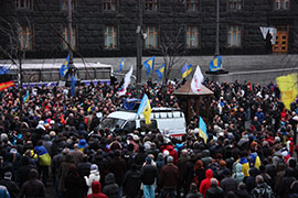 Біля центрального входу в будівлю уряду стоять близько 10 автобусів, в яких перебувають бійці спецпідрозділу Беркут. Деякі з них стоять на вулиці, на невеликій відстані від людей.