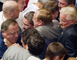 Народні депутати із фракції "Регіонів" стоять біля трибуни, щоб сюди не змогли пройти представники фракцій БЮТ та "Наша Україна".