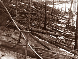 Зона повалення дерев в 5 кілометрах від епіцентра вибуху. Фото 1929 року. Зображення з сайту Tunguska.ru. 98 років назад вибуховою хвилею було повалено близько 80 мільйонів дерев. |
