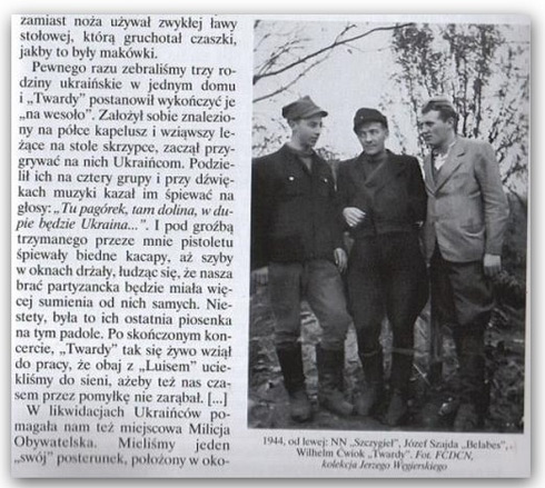 І далі: «У ліквідації українців нам допомагала також місцева громадянська міліція і органи внутрішніх справ соціалістичної Польщі. Ми мали один свій відділок, розташований в околиці Динова, близько Сяна, який допомагав нам тим, що після арешту українців, які підозрювалися в підпалі польських сіл (тобто – українських, спалених самими українцями під час насильницької депортації, щоб не майно не дісталося полякам – І.Ф.) просто давали нам знати через зв’язківця, що такий і такий українець чекає на нас у відділку та може бути забраний. Тоді була лише робота для мене і «Твардого». Йшли туди переважно ввечері і потім над річку. Тут ставили людину на підвищення для певності дірявили її кулями з автоматів, так що вже мертве тіло падало до води… Вояки відділу Кедиву «Лонка» з Новогрудського округу АК у диверсійному підрозділі робилися часом речі, які навіть мені самому не подобалися».
