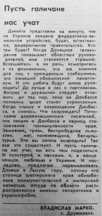 Українофоби різного забарвлення не втомлюються запевняти, що на загал вони нічого не мають проти України, їм лише муляє все галицьке, яке вони силкуються представити чимось зовнішнім і ворожим українському. Їх дуже обурює міфічна ними самими вигадана «галицька мова» (що насправді виявляється літературною українською), «галицький правопис» (що насправді є харківським правописом 1927-1929 рр.) і «галицькі націоналісти» (що насправді часто-густо були уродженцями запорізької землі, як Дмитро Донцов, Херсонщини, як Євген Маланюк, Чернігівщини за сучасним адміністративним поділом, як Микола Міхновський, Криму й Одеси, як батько та син Липи, Полтавщини — як Кирило Осьмак тощо). Коли запитуєш, а що ж питомо галицького, такого, що не було б власне українським, є в тих гаслах, що озвучують галичани, відповідь отримати неможливо...